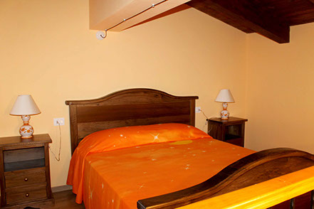 Una stanza ampia e luminosa ideale sia per un soggiorno di coppia, sia per una vacanza di gruppo o in famiglia. La camera è infatti dotata di un letto matrimoniale e di un divano letto, e permette di ospitare fino a quattro persone. La camera è arredata in modo semplice, in armonia con la scelta stilistica della casa, con le calde sfumature dei rosa e degli arancioni a fare da tema sia per i complementi di arredo sia per le pareti.