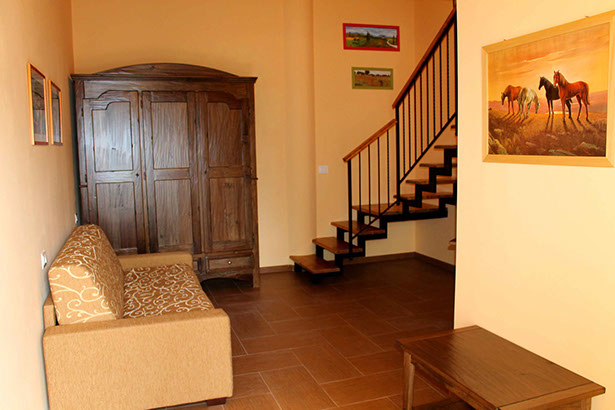 Una stanza ampia e luminosa ideale sia per un soggiorno di coppia, sia per una vacanza di gruppo o in famiglia. La camera è infatti dotata di un letto matrimoniale e di un divano letto, e permette di ospitare fino a quattro persone. La camera è arredata in modo semplice, in armonia con la scelta stilistica della casa, con le calde sfumature dei rosa e degli arancioni a fare da tema sia per i complementi di arredo sia per le pareti.
